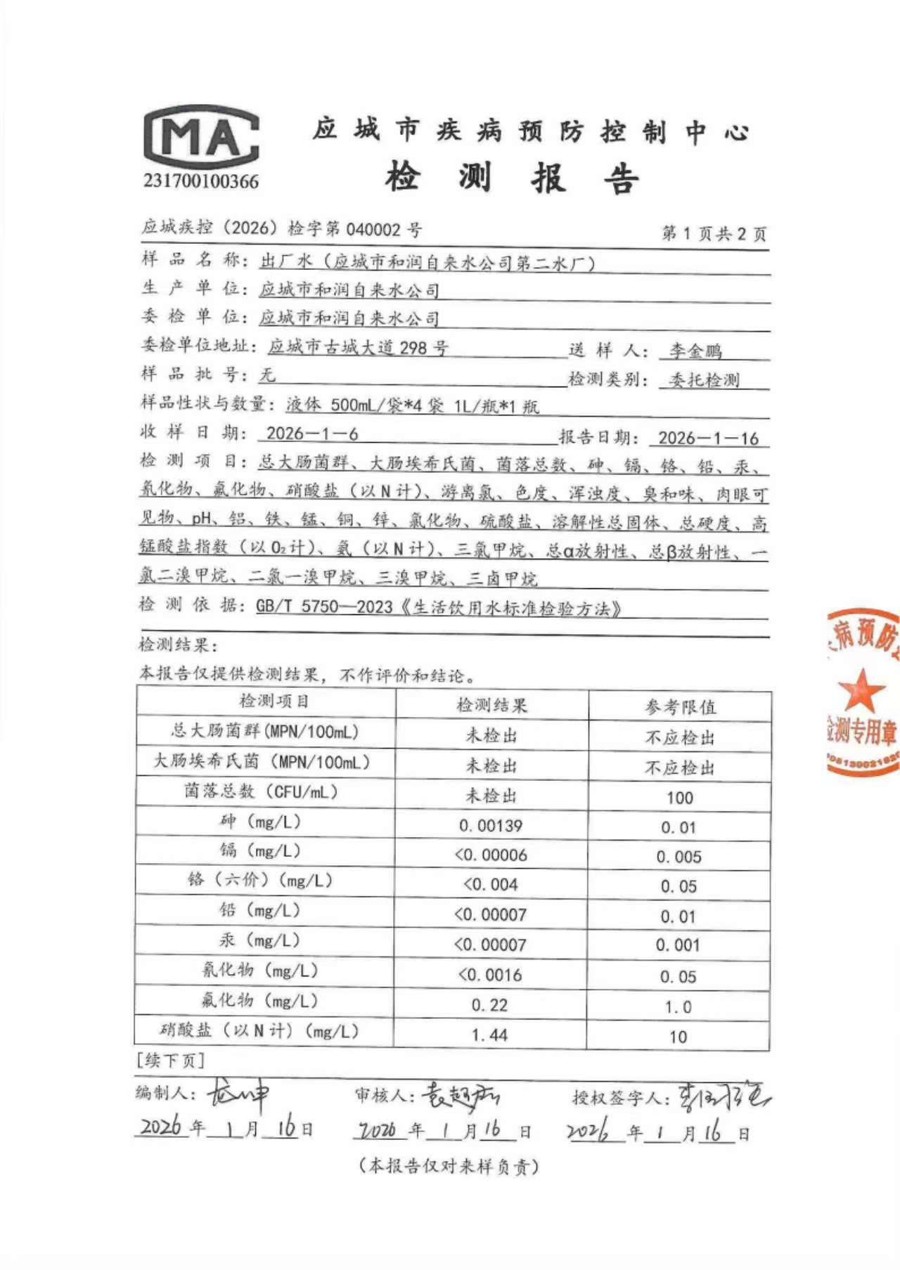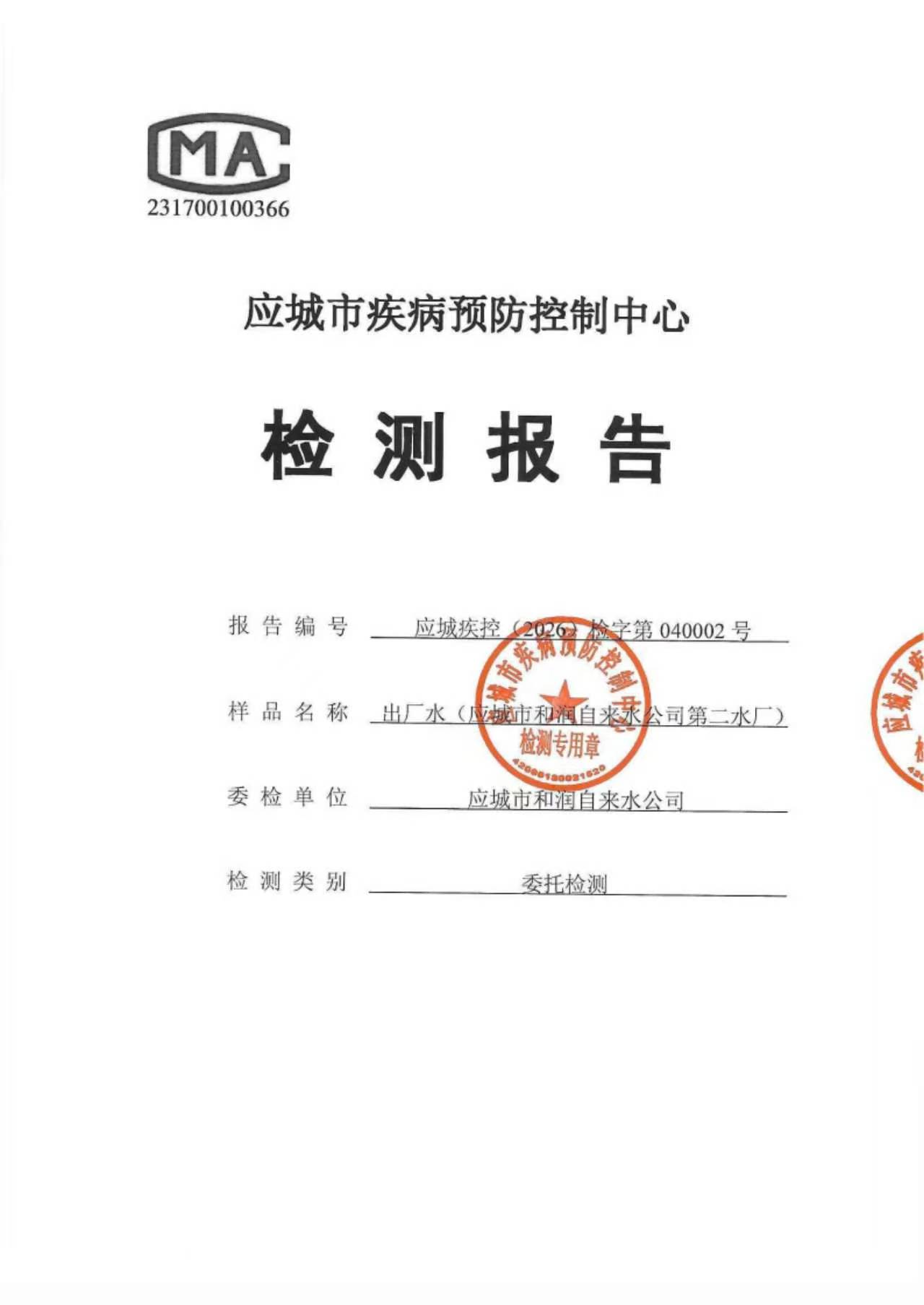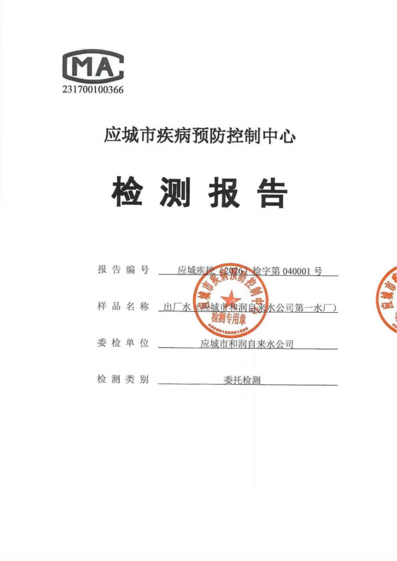 2026年1月份出厂水水质检测报告