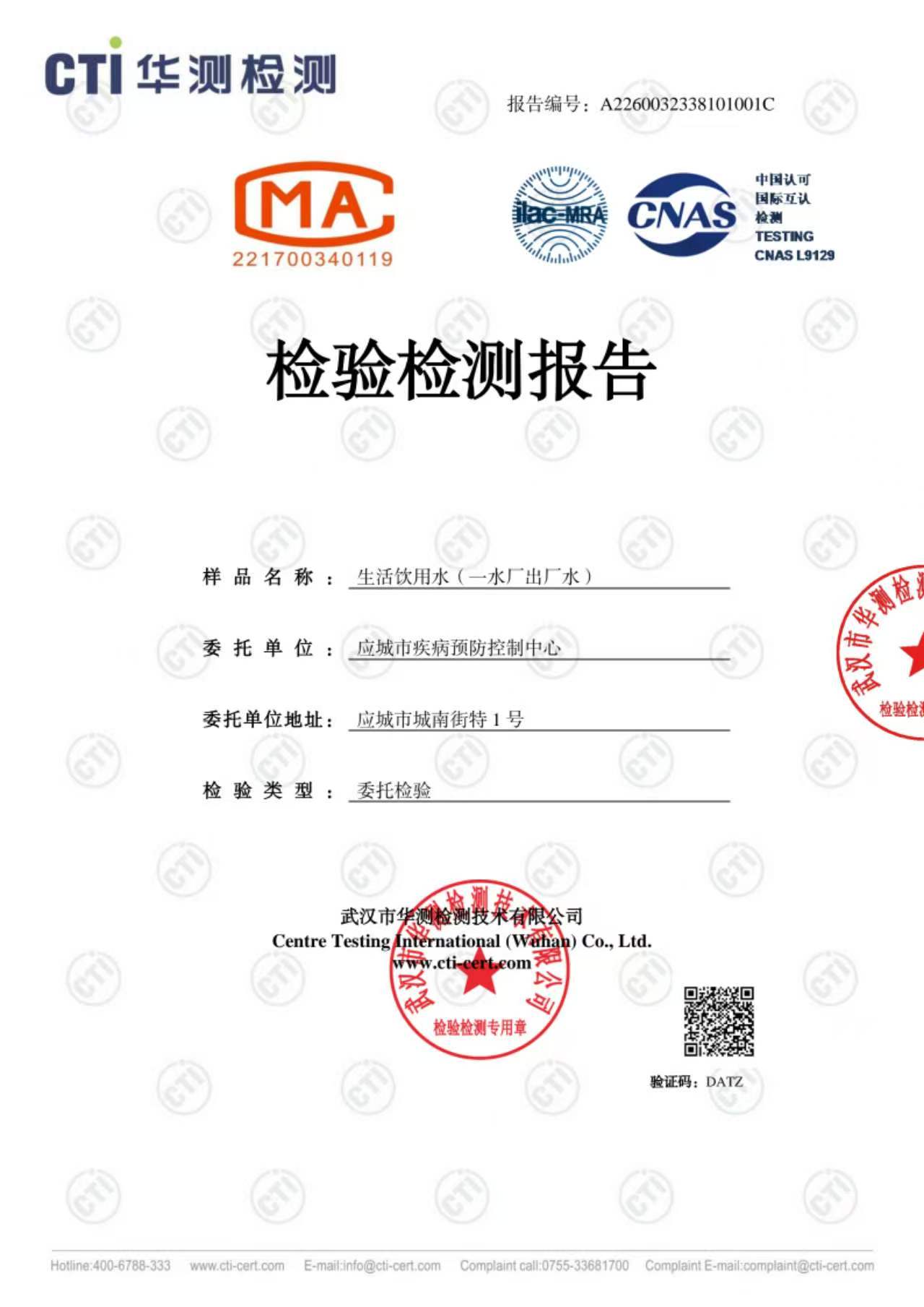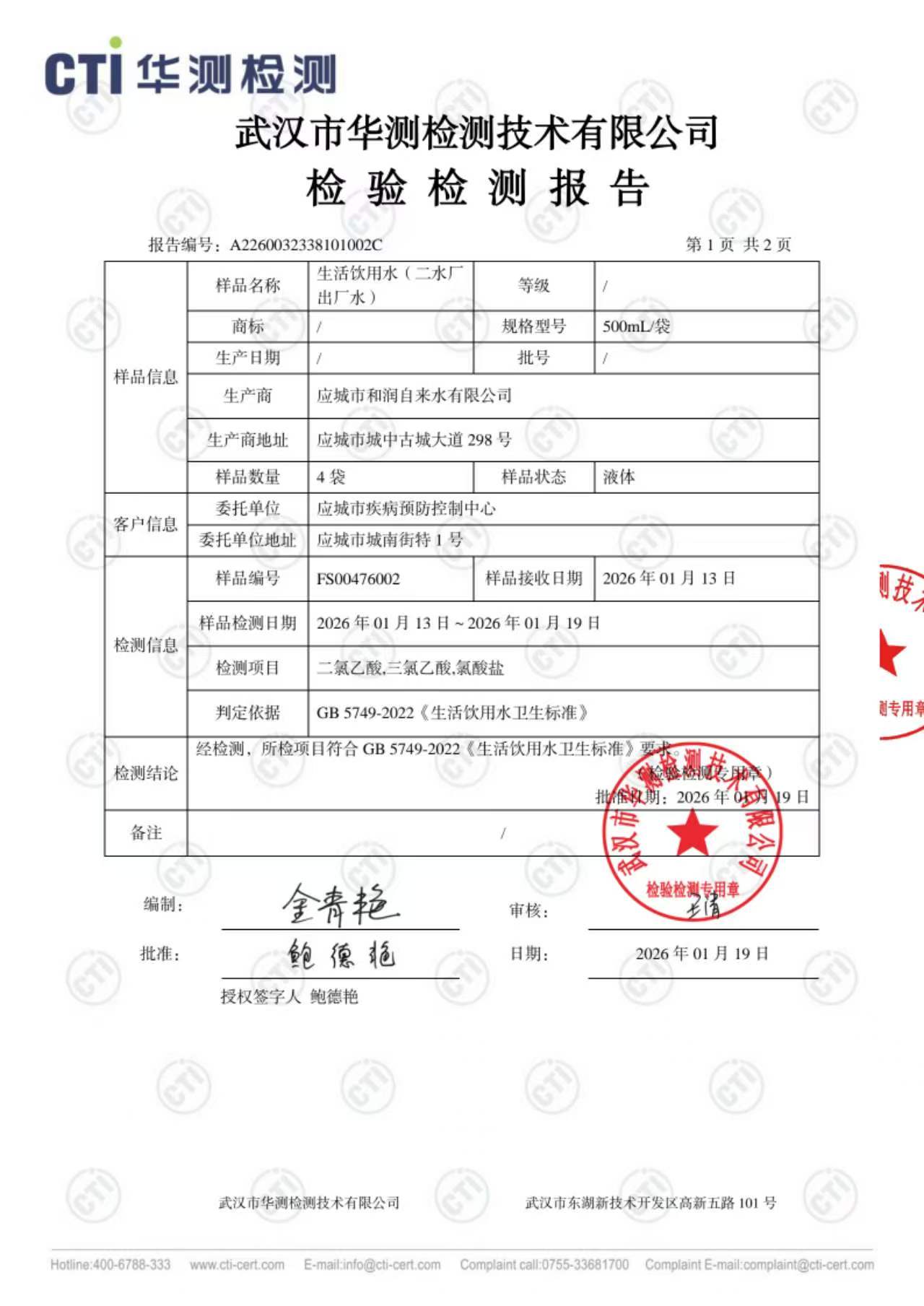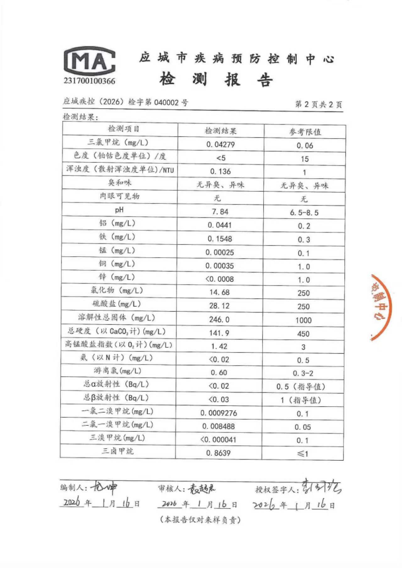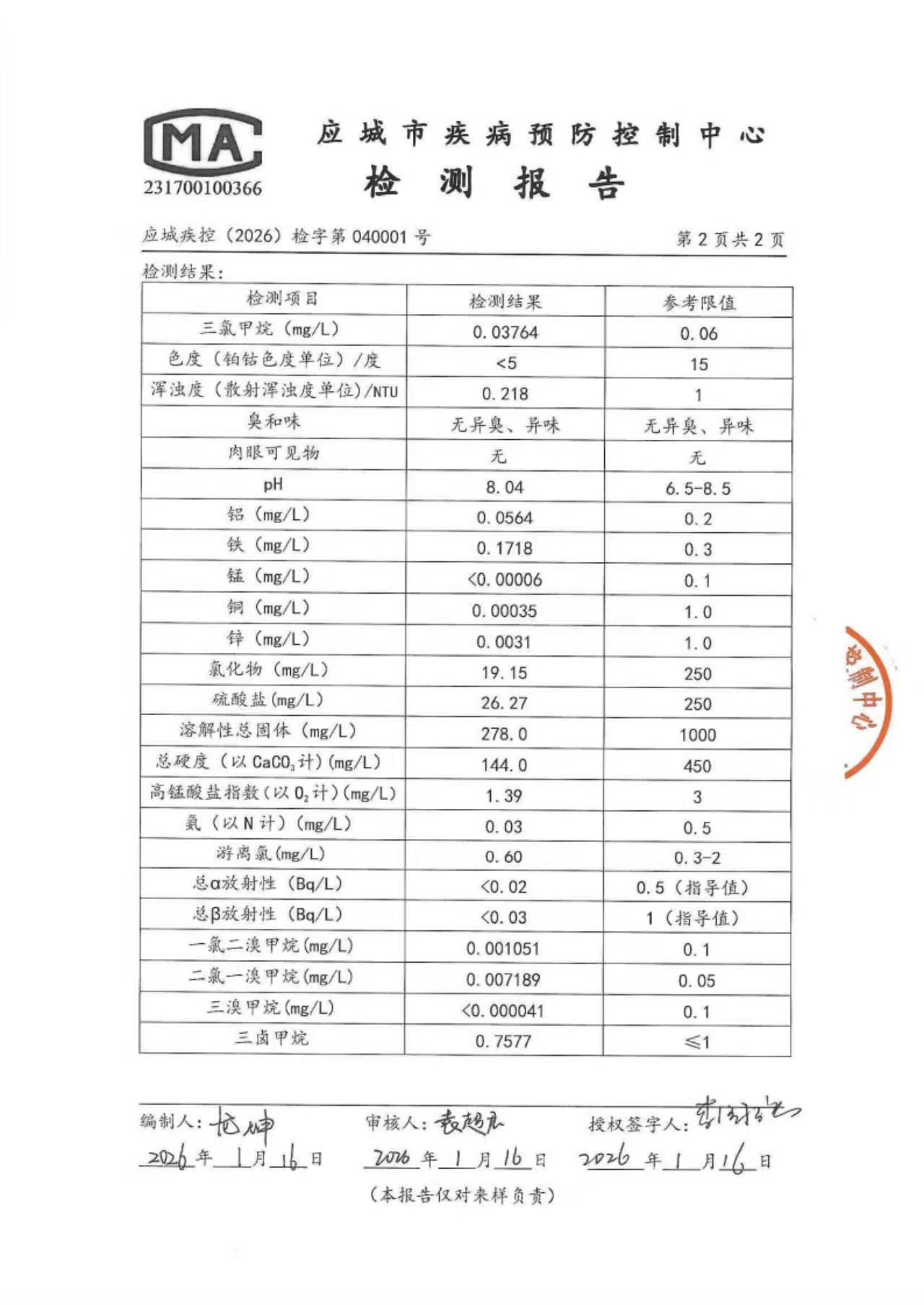 2026年1月份出厂水水质检测报告